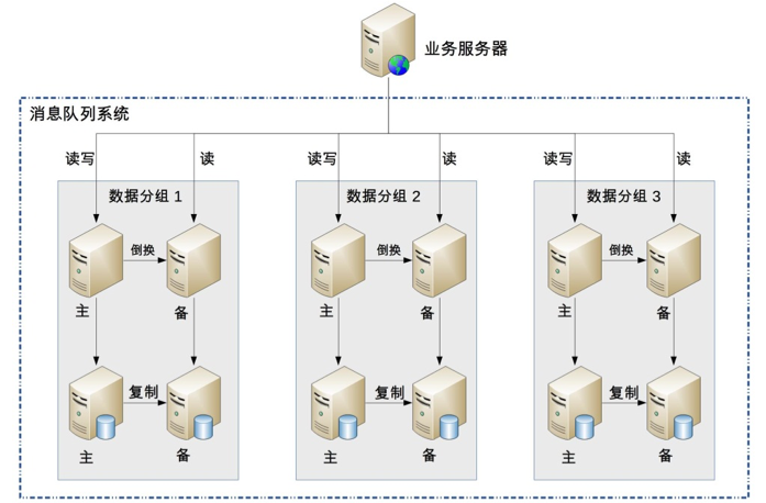 每个分组有一主一备两台服务器,主服务器支持发送和读取消息,备服务器只支持读取消息,当主服务器正常的时候备服务器不对外提供服务,只有备服务器判断主服务器故障的时候才对外提供消息读取服务。